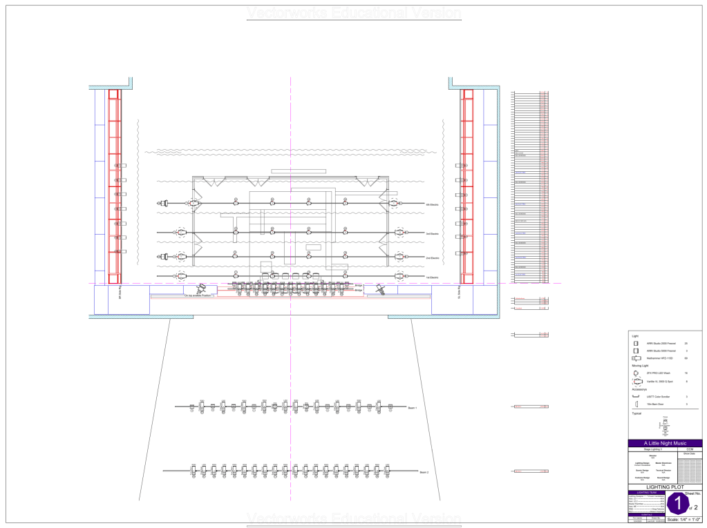 Rather than just creating a design for a random show, for lighting design class we had the chance to work with the Nederland’s Reisopera. Each student was tasked with creating a design for A Little Night Music using the inventory of the Reisopera. When designing in the Wilminktheater (the Reisopera’s home theater) I came across something completely new to me – a moving portal bridge. Having a permanent piece of masking with a permanent place for lights was a new design opportunity. Another consideration that we had to deal with was focus time because of the Reisopera tours with all of their shows. Along with these considerations, I have never seen the theater in person so I learned how to choose where to place lights without access to the theater.